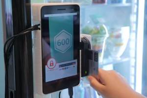決済方法は完全にキャッシュレス。付属のタブレット型決済機にクレジットカードをスワイプすると、扉の鍵が開きます。買いたい商品を取り出してドアを閉めると、冷蔵庫から取られた商品が自動的に検出されます。最後に購入完了ボタンを押すと決済が行われ、購入完了となる仕組みです。
