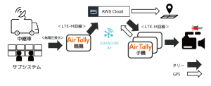 サービスとして完成したAirTallyは、「親機」が中継車やサブシステムとの接点からタリーの情報を取得し、AWSを経由してカメラに装着した「子機」にタリーを伝送すると、ランプが光ってそのカメラの撮影を知らせる仕組みです。