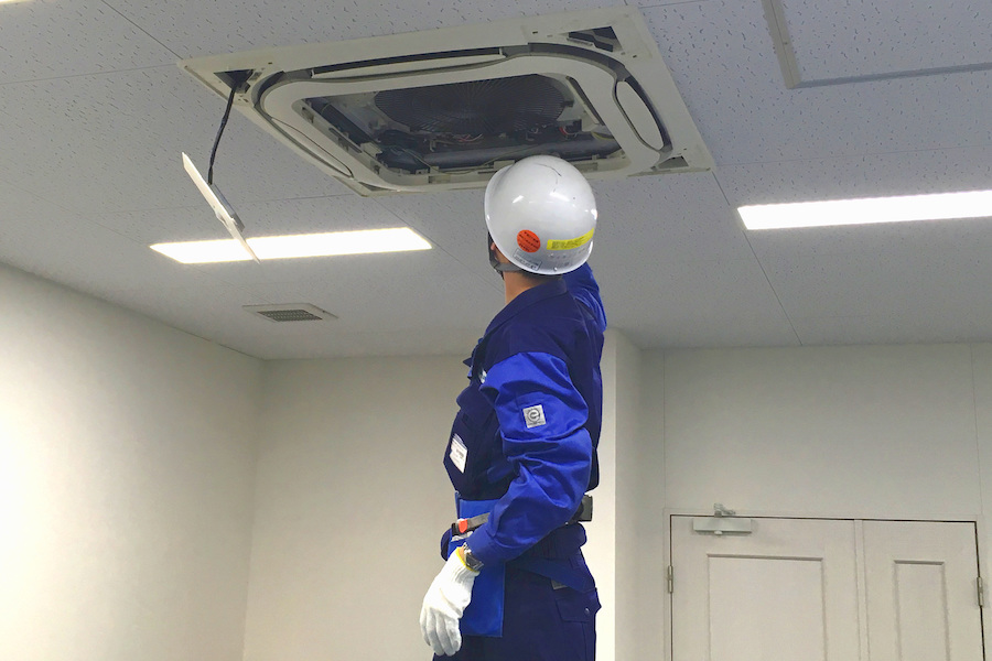 空調機器内で排水の役割を担うドレンパン(受け皿)は、汚れや異物が排水部に詰まると水漏れや空調機の異常停止の原因となるため、おおよそ 1 ヶ月に 1 回、定期的な汚れ具合の目視点検や清掃が必要です。天井部にとりつけられる空調機器の内部にドレンパンがあるため、点検者は天井板をはずし、天井の裏側から空調機械の部品を分解して、ドレンパン部分を目視する必要があります。