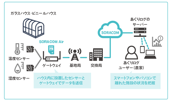 農業施設は、屋外ということもあり通信ネットワークのない場所にあります。そこで電源と端末があればすぐに通信できる「SORACOM Air for セルラー」をあぐりログに採用しています。