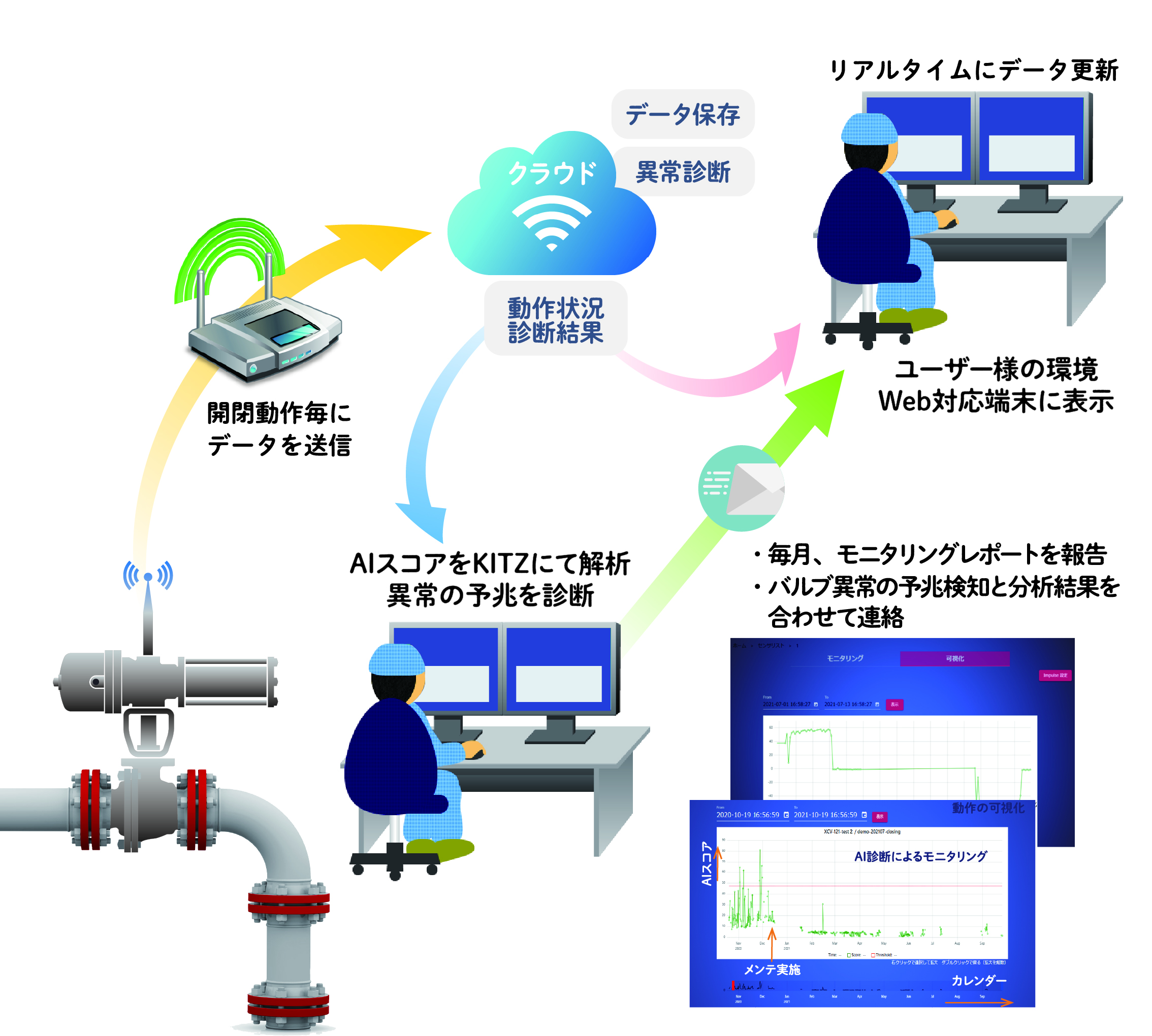 バルブの部品は利用に伴い徐々に消耗・劣化していきますが、経年や利用頻度、扱う流体等の条件によって、そのパターンは様々です。本サービスでは、on/off制御バルブの開閉の動作をデータで収集し可視化することで、バルブの状況を把握します。クラウドに保存されたこれらのデータをAI技術でスコア化、キッツの専任チームが毎日監視し(キッツの営業時間内)、異常の予兆を診断した場合は、メンテナンスが必要であることをお客様にお知らせします。