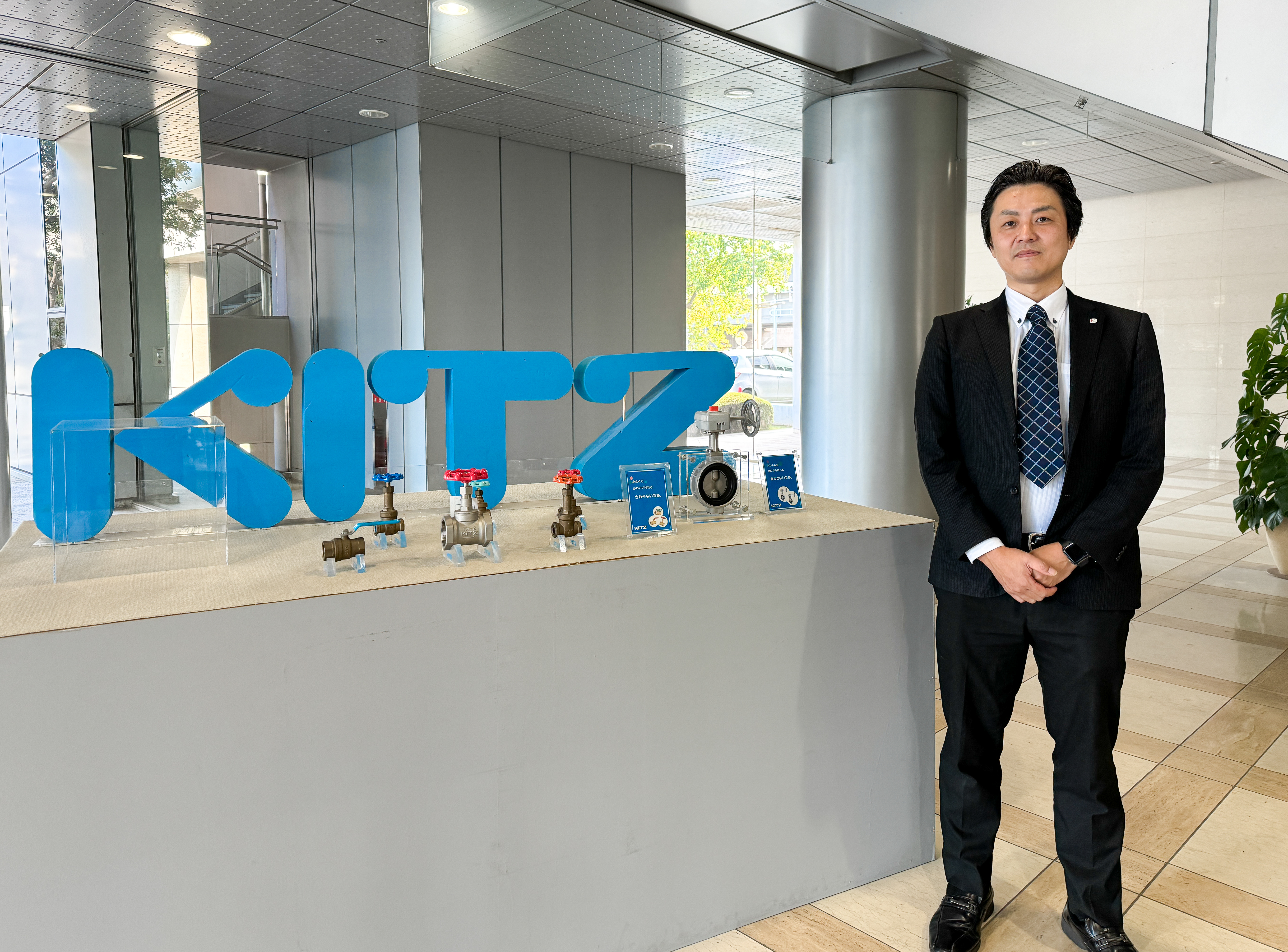 株式会社キッツは、国内市場における最大手で世界でもトップ10に入る総合バルブメーカーです。バルブは、配管内の水・空気・石油・ガスなどの液体や気体、粉体を流したり、止めたり、流量をコントロールする機能を持つ流体制御装置です。下水道、給湯、ガス、空調などの生活に身近な用途から、石油、化学、医薬品、食品などあらゆる産業の生産プロセスに使われています。