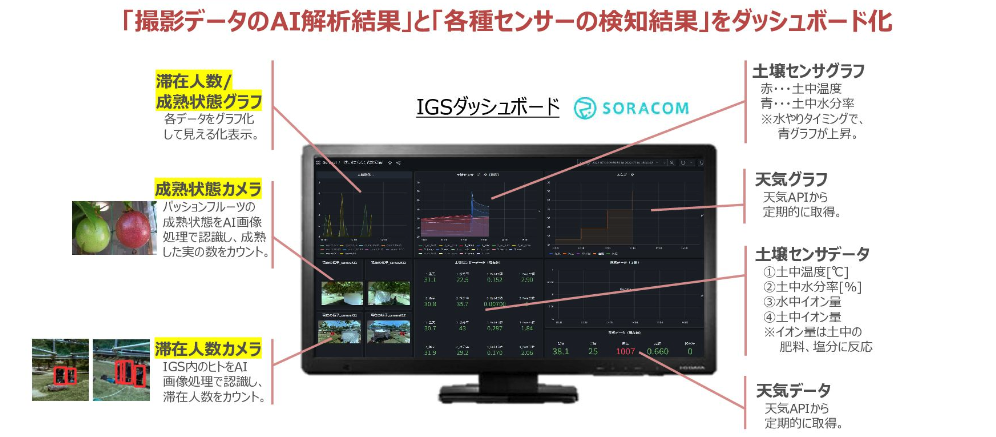 顧客起点でカメラの導入や高機能化を取り入れ、緑化シェードの利用人数をカウントするため、SORACOMのセルラー通信搭載のエッジAIカメラを採用、自社開発したAIアルゴリズムを用いた人数カウントや、パッションフルーツの生育状況の判別を行いました。パッションフルーツは熟すと緑から赤く変化するため、AIで5段階に推論し、収穫のタイミングまで判断できる基準を作りました。