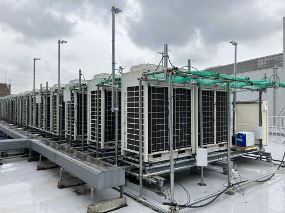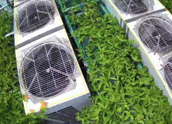 2023年は、不動産デベロッパーから「IoT緑化シェード」をビル屋上の室外機の省エネソリューションとして活用できないかとの提案を受けたため、東京都内のビル屋上にて検証を行いました。都内にあるオフィスビルの屋上に並ぶエアコンの室外機と室外機の間にパッションフルーツの枝葉で日陰を作り、その下の空気を冷やす取り組みです。冷やした空気を室外機が吸うことで、エアコンの消費電力を抑えることができるかどうかを検証しました。今回のPoC(実証実験)では、「IoT緑化シェード」の基本システムに加えて、ソラコムのクラウド型カメラサービス「ソラカメ」を室外機の上下に6台ずつ計12台使い、2つの目的で運用しています。
