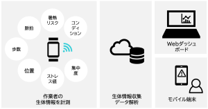 着用者の脈拍、歩数、位置などの基本情報に加え、暑熱リスク、ストレス値、集中度、体のコンディションの変化を可視化し、リアルタイムにアラートを提供することができます。