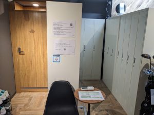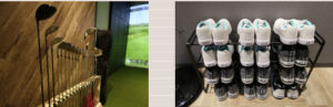 東京・九段下にあるGolFairは、効率よく練習ができるよう高性能なシミュレーターを配した打席が個室・半個室合わせて4つあり、各打席にレンタル用ゴルフクラブが並べられています。ロッカーや更衣室が完備され、シューズの貸し出しも行っており、手ぶらでいつでも利用できます。