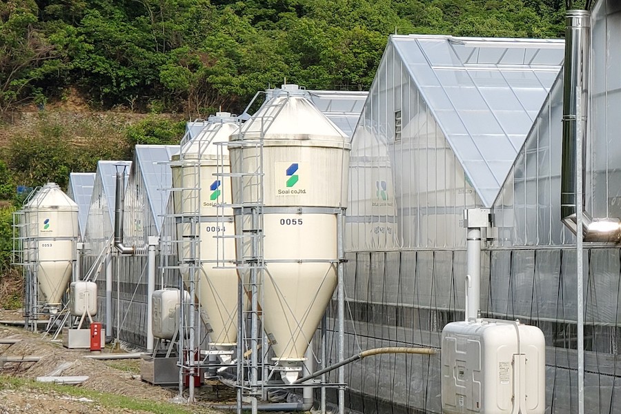 相愛では、施設園芸農家様に導入した全国200基超の加温ヒーターのうち約70基に対し、設備のメンテナンスから燃料となる木質ペレットの配給まで行っています。加温ヒーターの利用は、10月から始まり冬場最も利用されます。木質ペレットは、加温ヒーター設備に隣接された燃料タンクに貯蔵されます。