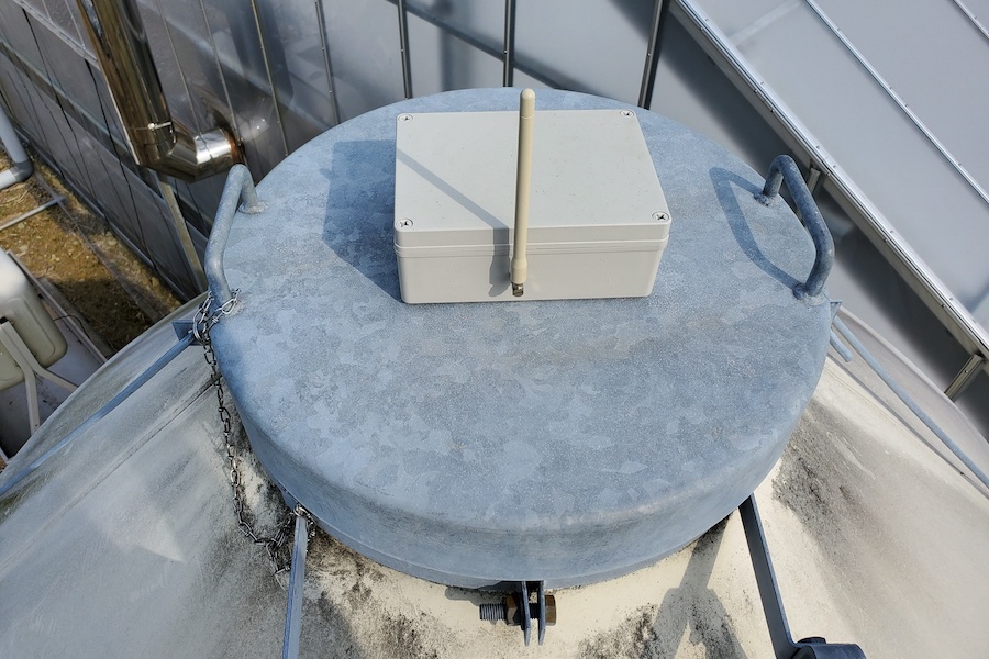 開発したIoTシステムでは、主に2つの現場データを取得しています。ひとつは、燃料となる木質ペレットのタンク内残量データです。レーザー距離センサーをタンク蓋部に取り付け、蓋部から木質ペレット表面までの距離を測ることで残量を把握します。もうひとつは、加温ヒーターの稼働データです。加温ヒーター制御盤から設備異常信号を取得し、残量データとともにSORACOMに送信します。これにより、木質ペレットの残量と、加温ヒーターの異常をリモート検知しています。