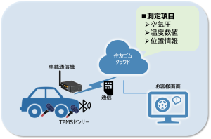 このような経緯から開発されたのが、タイヤの空気圧や温度をリモート監視する「空気圧・温度管理サービス」です。車にTPMS(タイヤ空気圧管理システム:Tire Pressure Monitoring System)と呼ばれるセンサーを取り付け、車載通信機を経由して、空気圧、温度数値、位置情報等のデータを測定しクラウドに送信しています。お客さまは、パソコンやタブレット、スマートフォンを用いて、リアルタイムでタイヤに関するデータを閲覧できるほか、アラート通知も受信できる仕組みです。