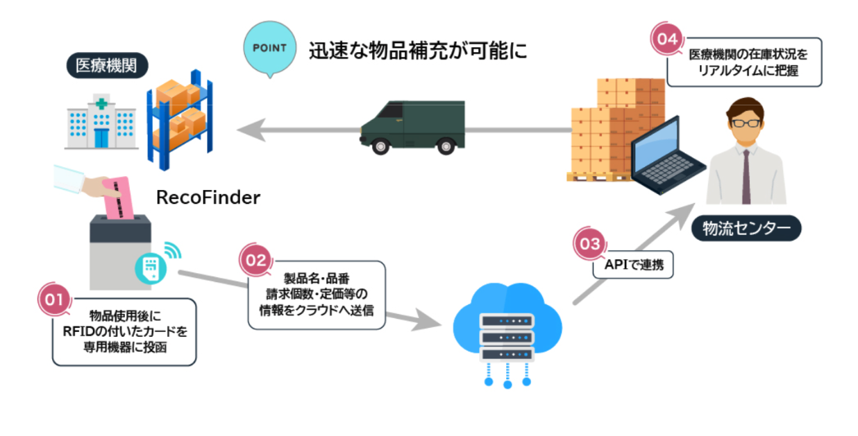 しかし、1日に膨大な量が消費されるため、バーコードの読み取り漏れといったヒューマンエラーが発生します。そこで「RecoFinder」では、バーコードをRFIDに代替。物品使用後、ICタグが埋め込まれたカードを剥がして専用機器に投函するだけで、消費個数を一気にカウントできるシステムを構築しました。さらに、消費情報をクラウドに送り、物流センターにもリアルタイムに連携。これまでの人によるアナログ作業が、大幅に削減できました。